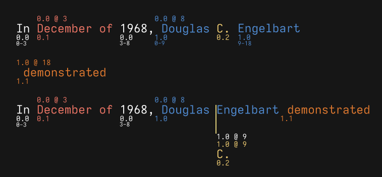 This process can continue recursively, with insertions building upon each other in a tree. In the animation below, both replicas insert additional text at different offsets within the blue insertion with id 1.0. To apply the remote operations, we again scan through the document looking for the fragment of insertion 1.0 that contains the specified offset.
