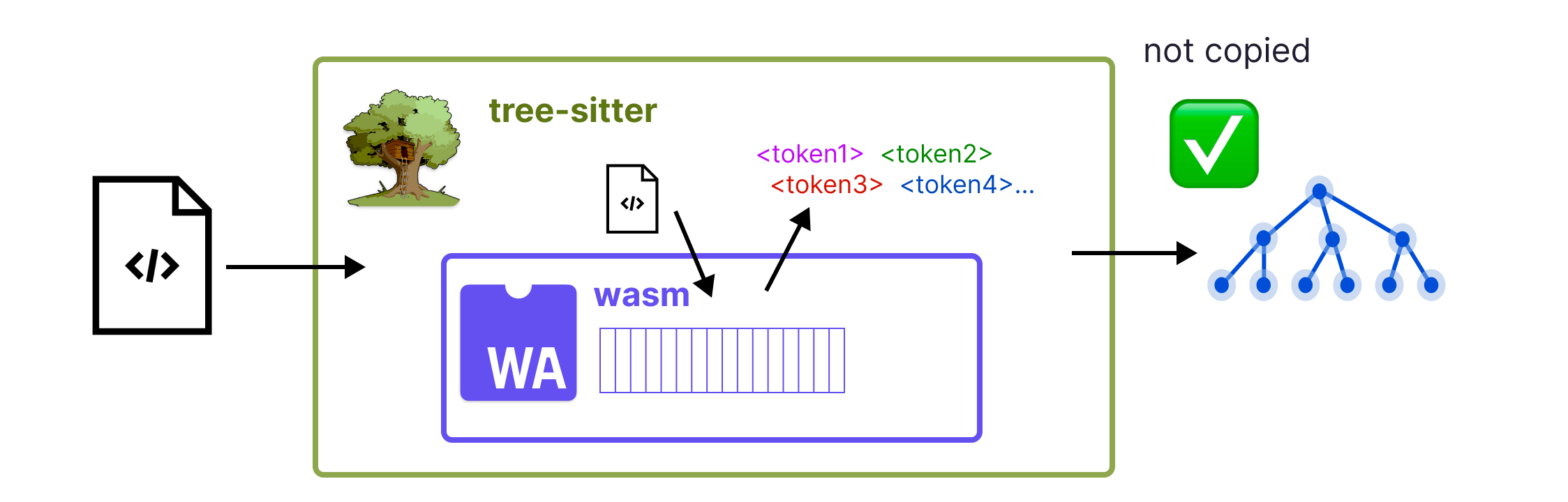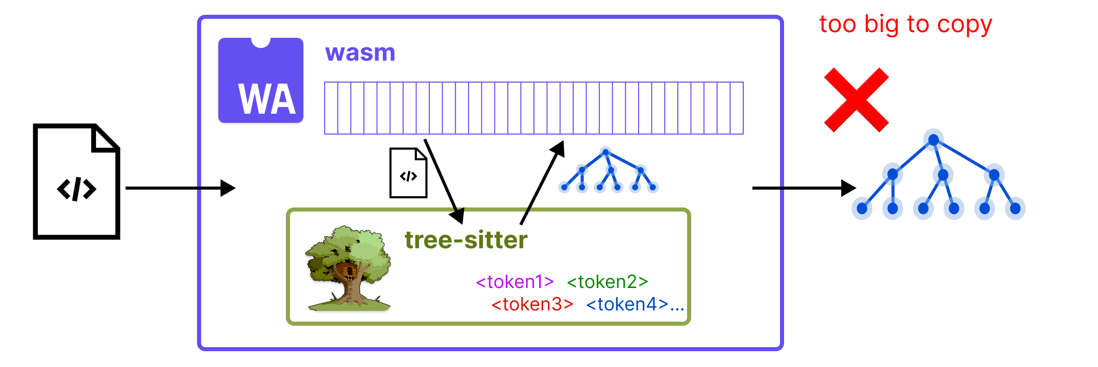 So if we ran parsers entirely via wasm, we would need to copy a huge amount of data out of the wasm memory on every parse. So simply compiling Tree-sitter and the grammars to wasm would not suffice.