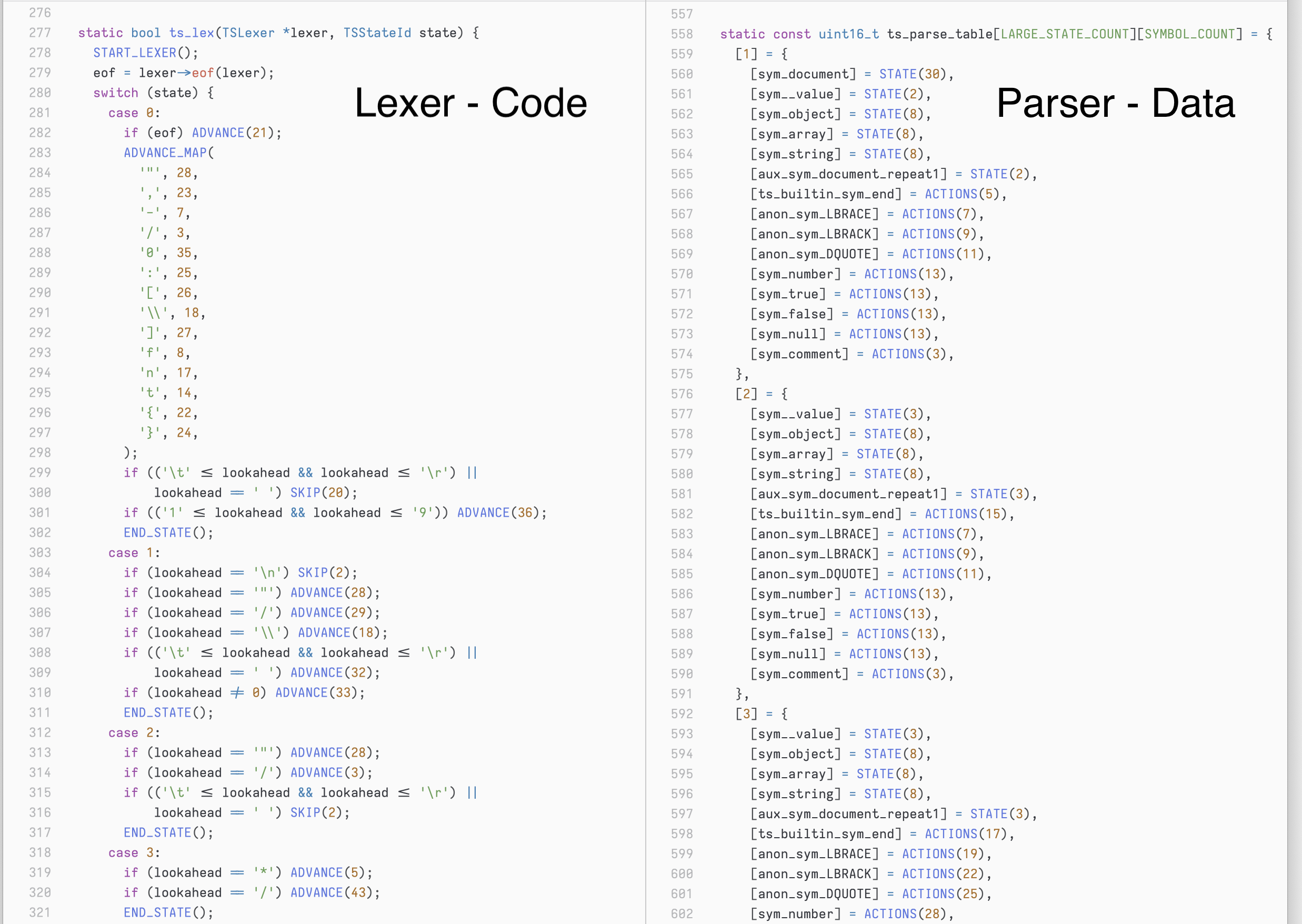 We decided to take advantage of the fact that Tree-sitter parsers are table-driven. Most of the generated C code consists of static arrays that represent a state machine.