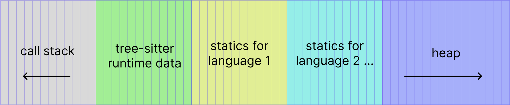 When using wasm, you have very low-level control over the details of how modules are linked and loaded. Modules declare imports for several constants that control how the wasm linear memory is laid out - the address where their static data should be placed, the base address of the call stack, and the start address of the heap. Here is a diagram of how a tree-sitter WasmStore's wasm memory is laid out: