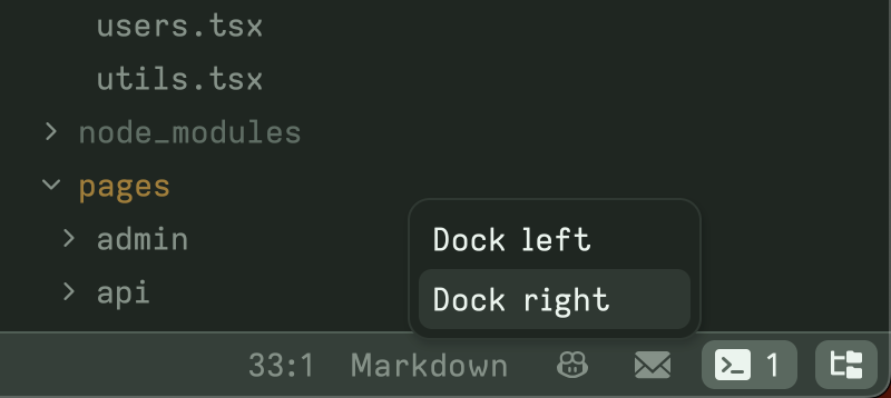 To change the location for either the project panel or the terminal panel, right-click on their respective panel icon and select the desired dock.