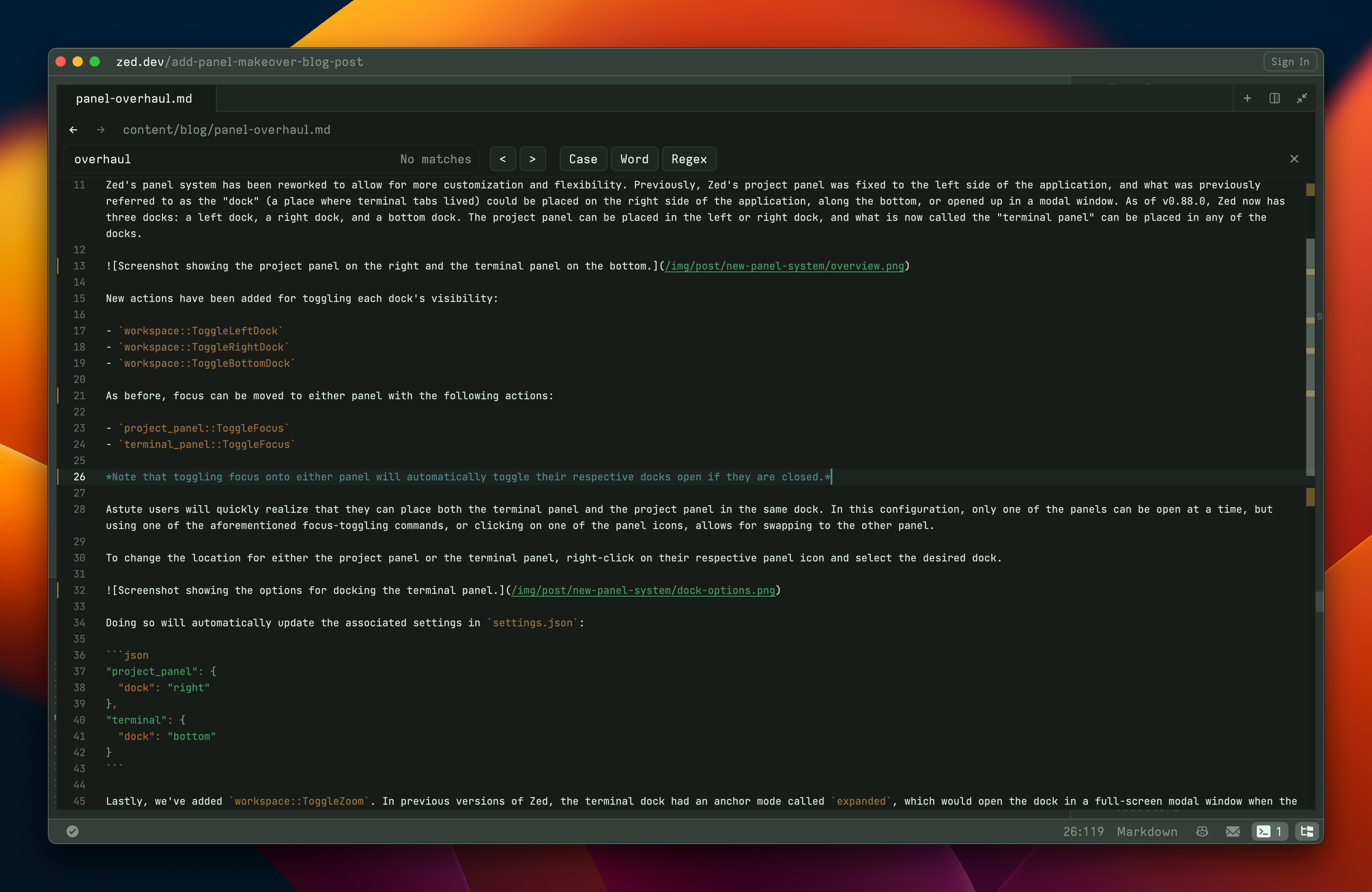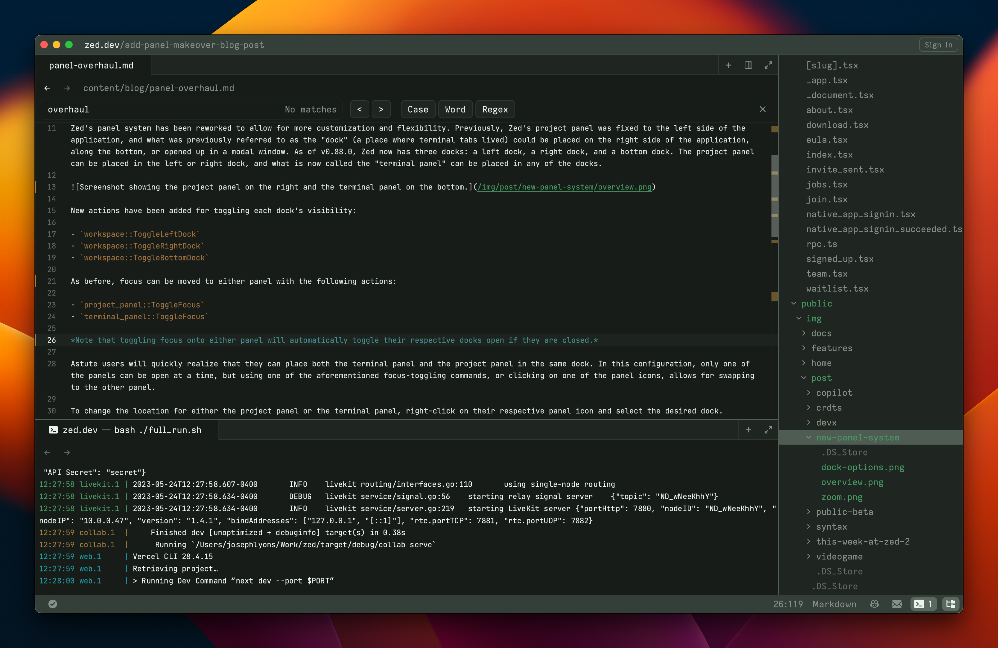 Zed's panel system has been reworked to allow for more customization and flexibility. Previously, Zed's project panel was fixed to the left side of the application, and what was previously referred to as the "dock" (a place where terminal tabs lived) could be placed on the right side of the application, along the bottom, or opened up in a modal window. As of v0.88.0, Zed now has three docks: a left dock, a right dock, and a bottom dock. The project panel can be placed in the left or right dock, and what is now called the "terminal panel" can be placed in any of the docks.