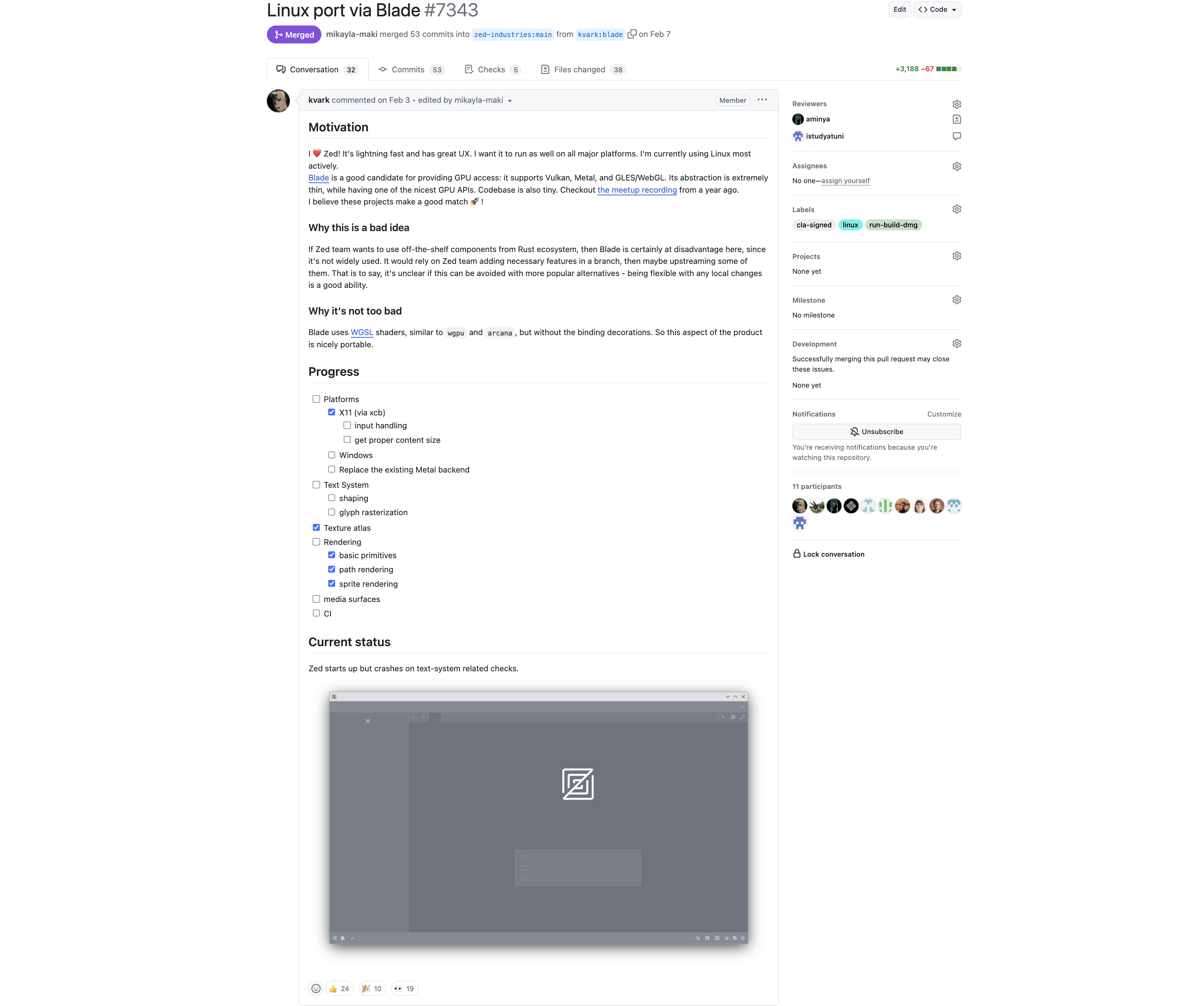 After @kvark opened the PR, Mikayla, Antonio, and Nathan reached out to him to talk about the feasibility of using Blade in Zed and shared goals. It didn't take long to get to a shared understanding and, exactly two weeks after open-sourcing Zed, the PR that made it compile and run on Linux was merged.