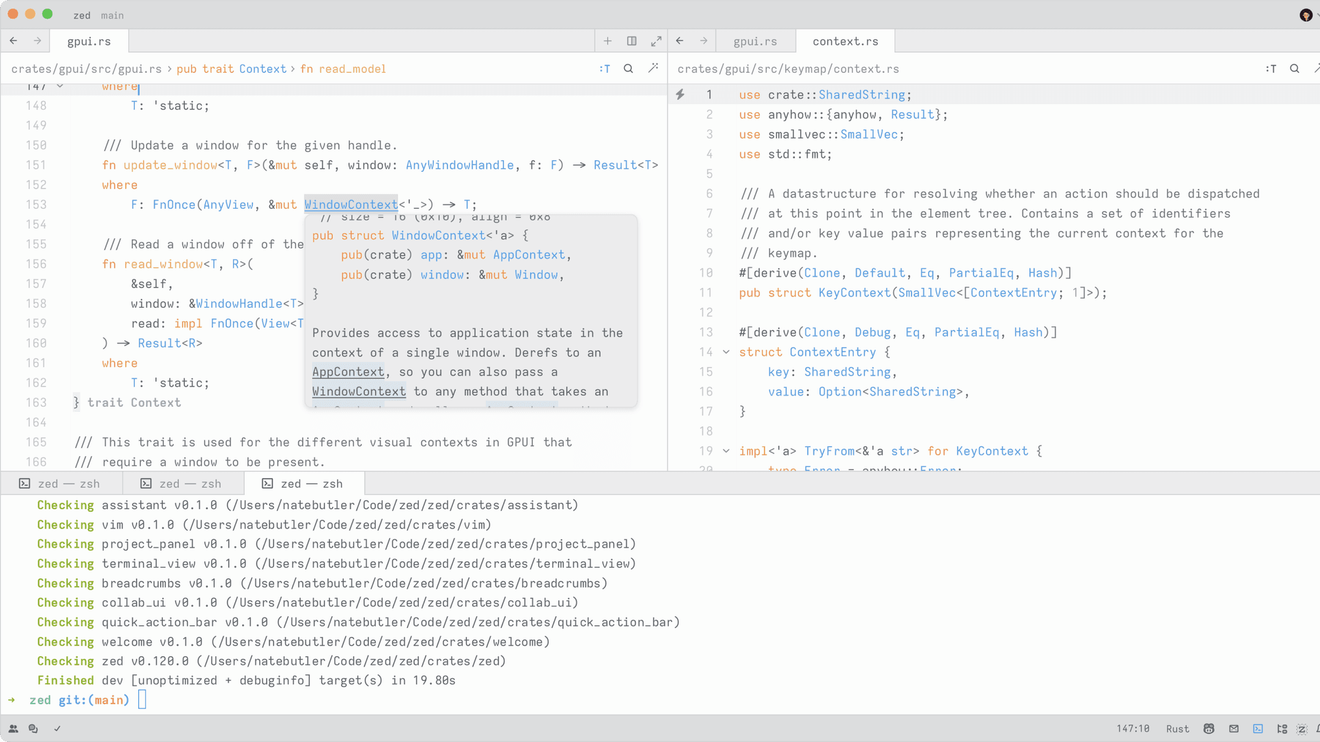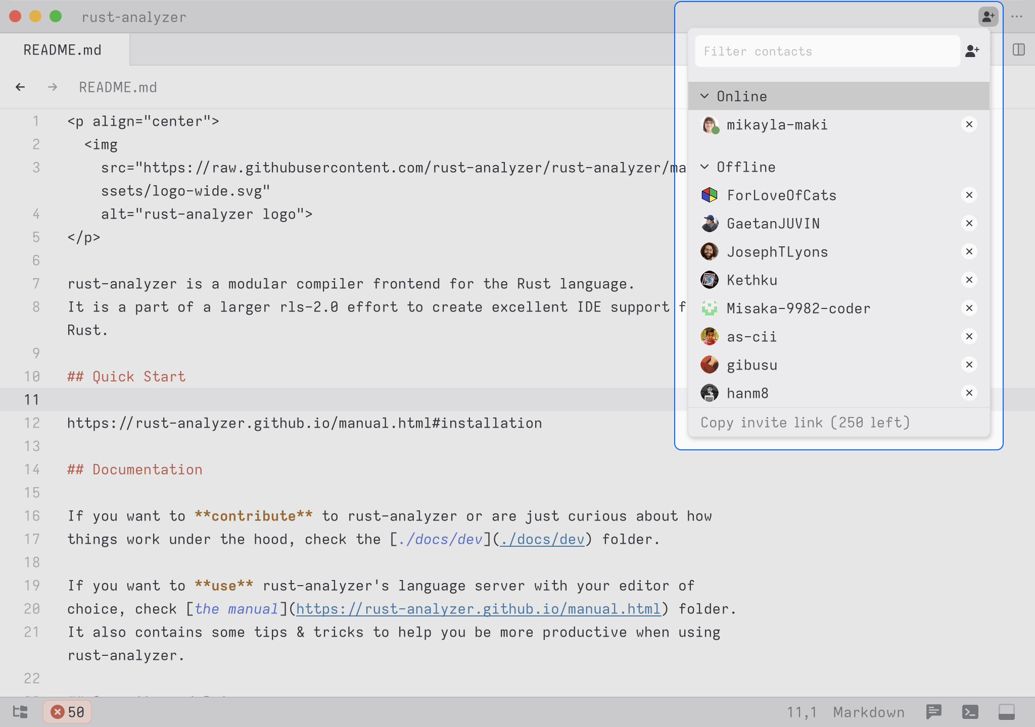 This will open a new window containing their project. Once you have joined the call, your zed windows will show the participants of the call next to your icon in the top right. Grayscale participants are in the call but currently viewing a different project. Non-grayscale participants are in the same project as you.