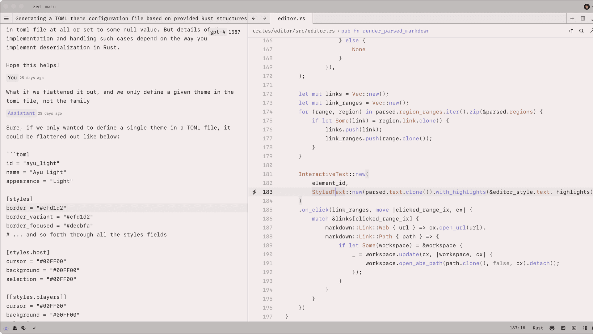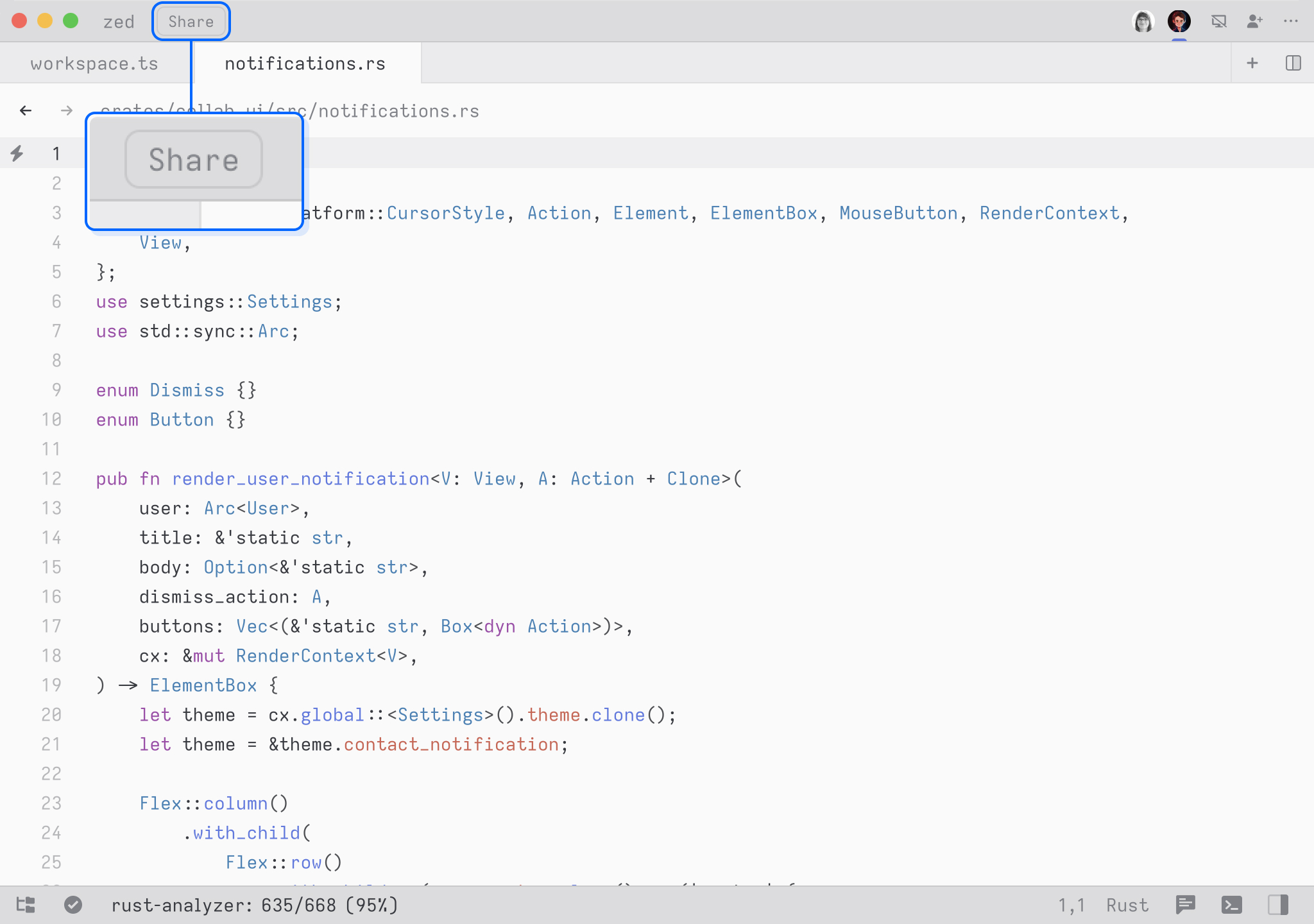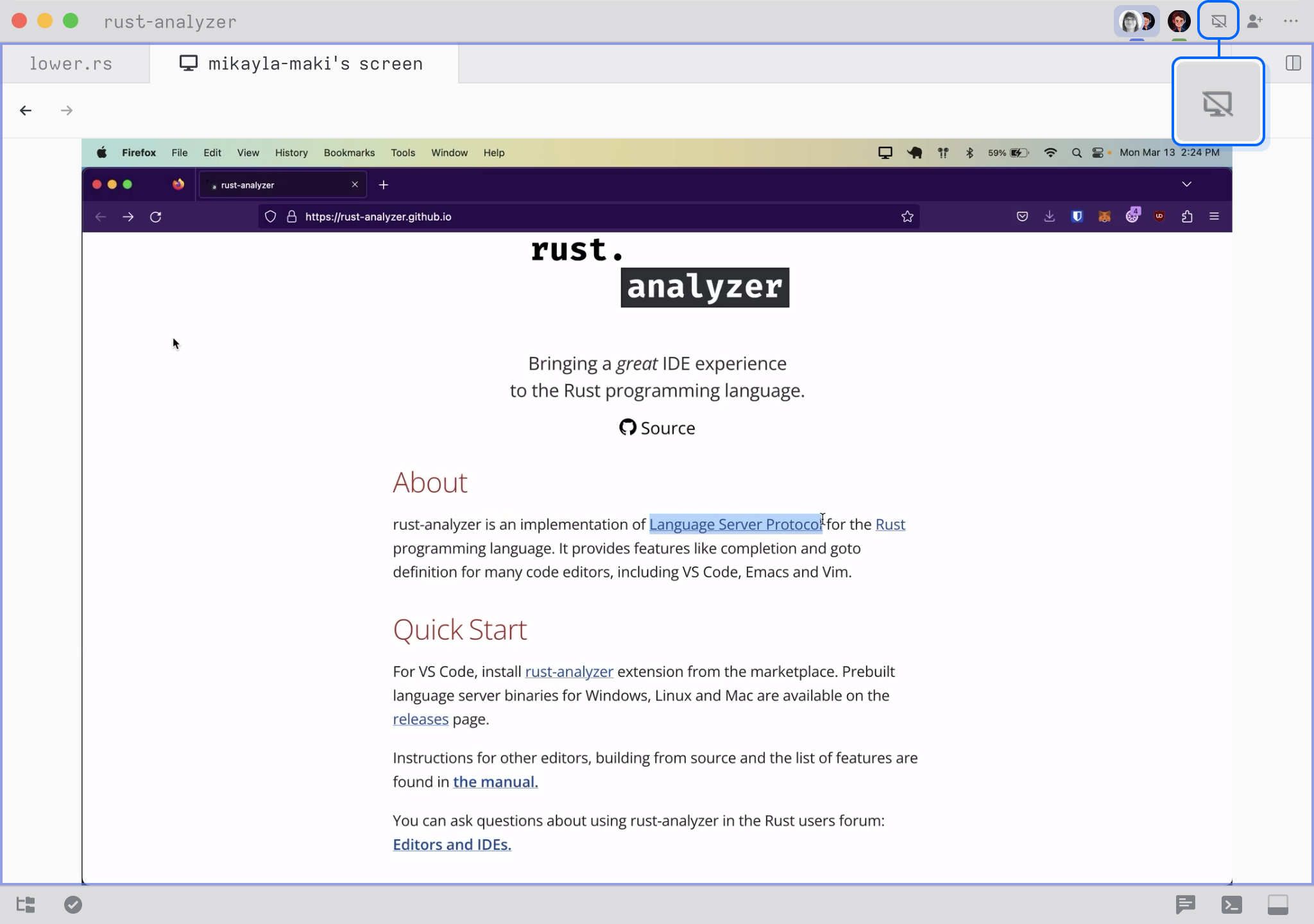 Sometimes you must go beyond code when collaborating, like looking at a website or a drawing. Zed's built-in screen-sharing allows you to share your screen without additional tools easily. Click the "Share Screen" button in the upper right to share your screen.